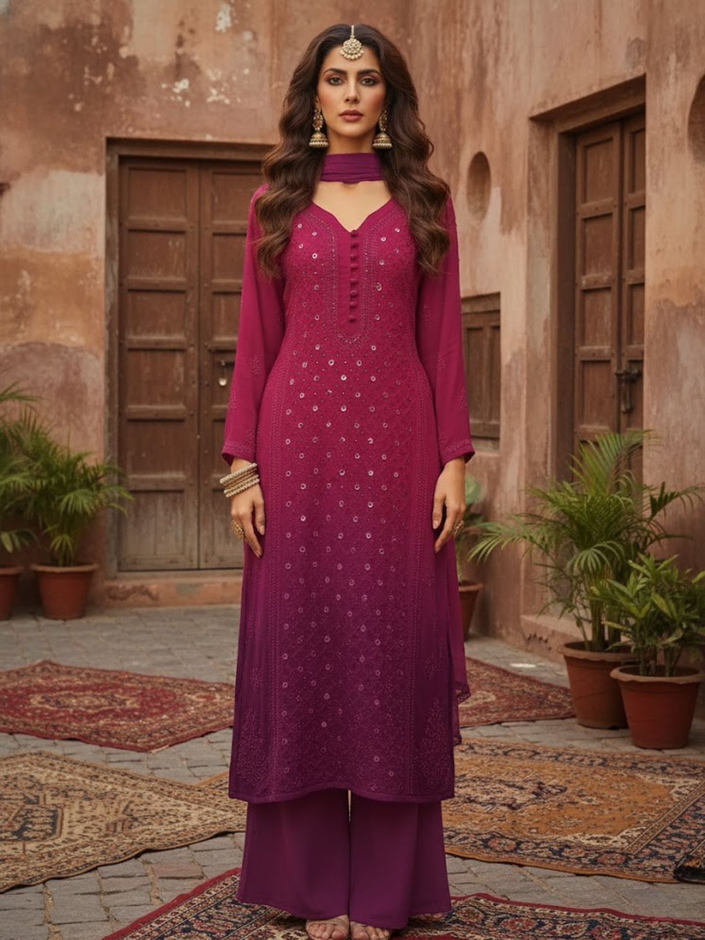 Paired with coordinated embroidered palazzo pants and a soft chiffon dupatta, this jewel-toned ensemble blends heritage artistry with contemporary ease—perfect for festive days, intimate gatherings, and refined celebrations.