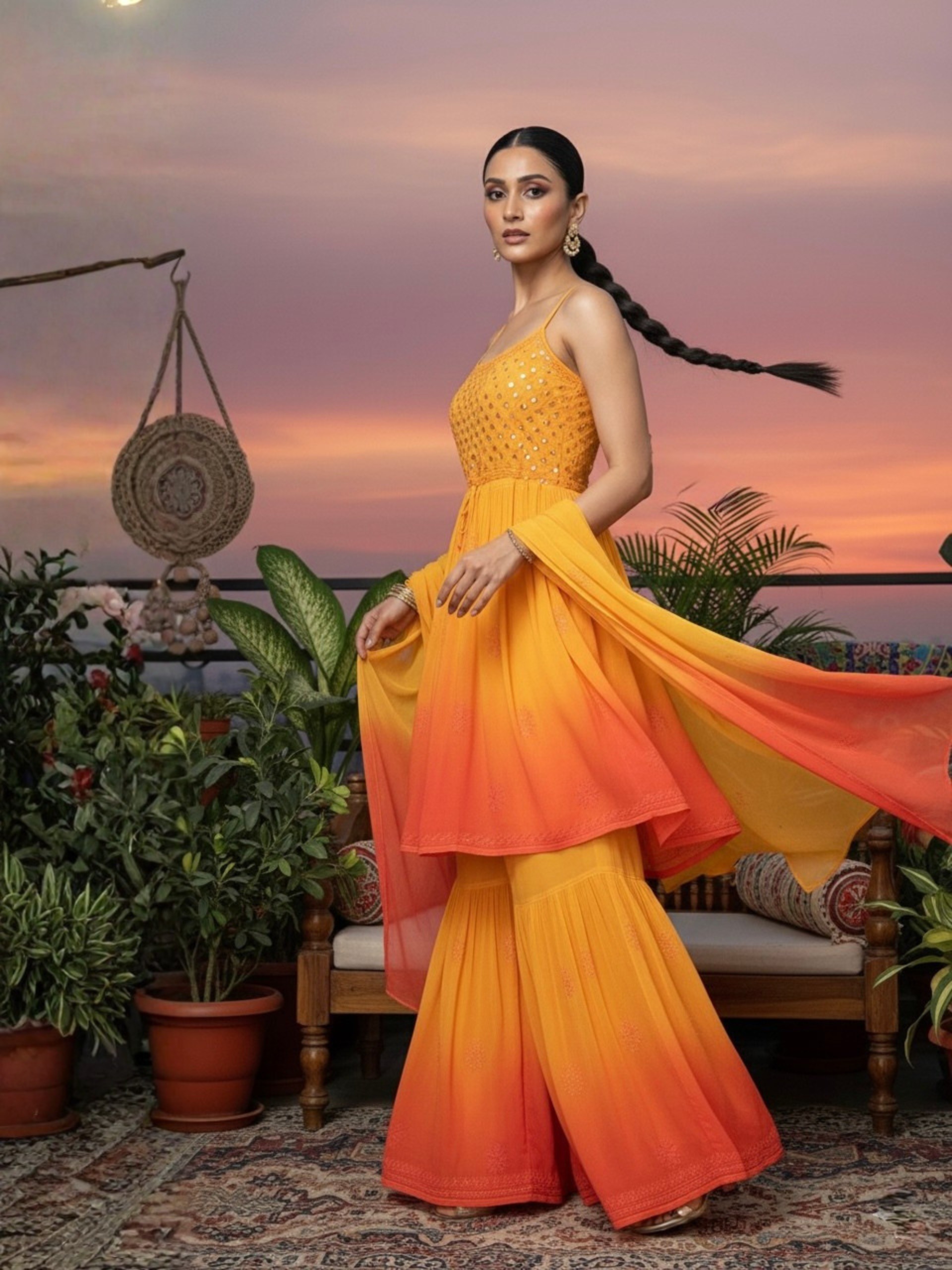 The flared short kurta is hand-embroidered with delicate Resham Chikankari and finished with subtle gold Mukaish that catches the light with every movement. Paired with a beautifully flared gharara and a soft chiffon dupatta, the set creates an elegant, fluid silhouette that feels both regal and contemporary.