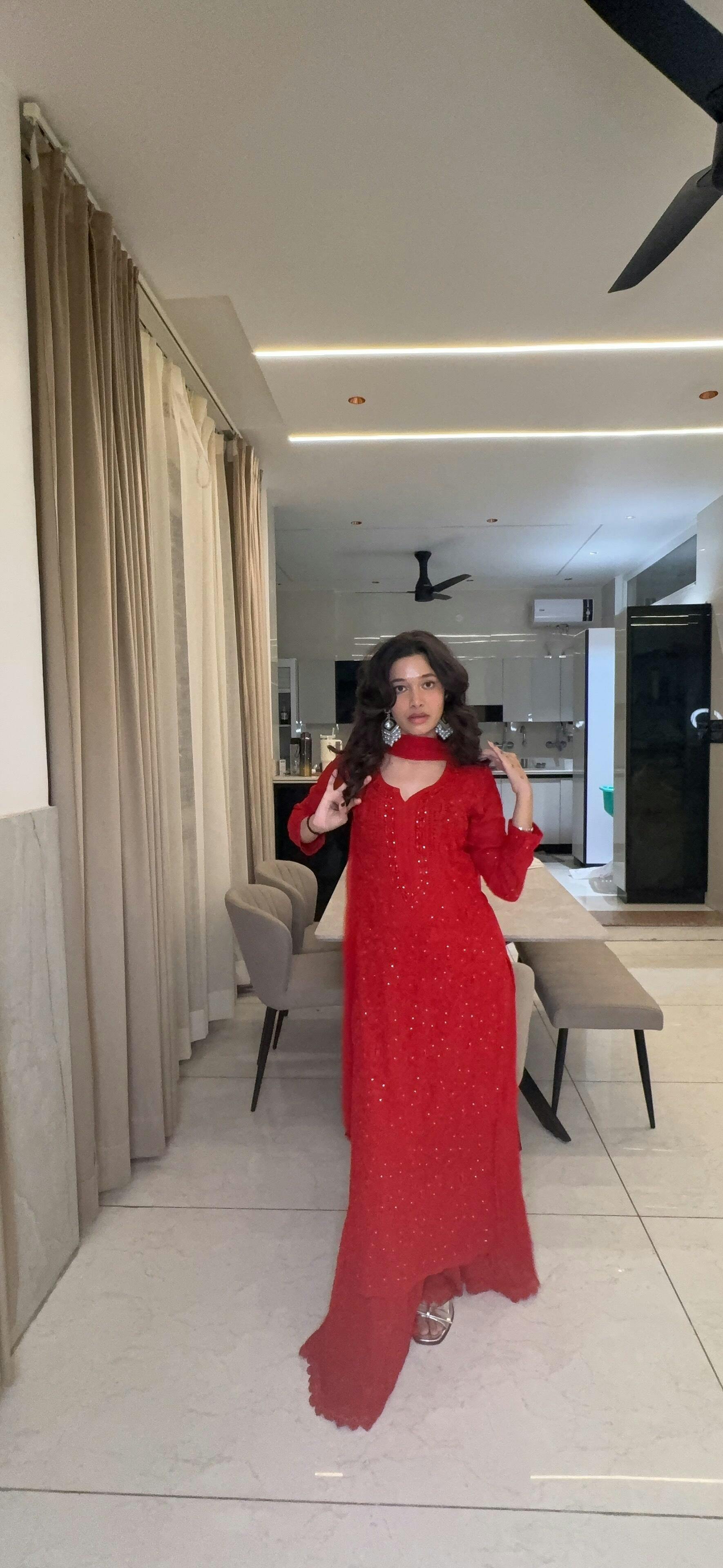 Step into a world of timeless sophistication with the Forbidden Red Long Chikankari Kurta Set, where traditional artistry meets contemporary elegance. This stunning ensemble features a full-sleeve, long kurta meticulously hand-embroidered with delicate Resham threads, paired with flowing palazzo pants and a soft, airy pure chiffon dupatta.