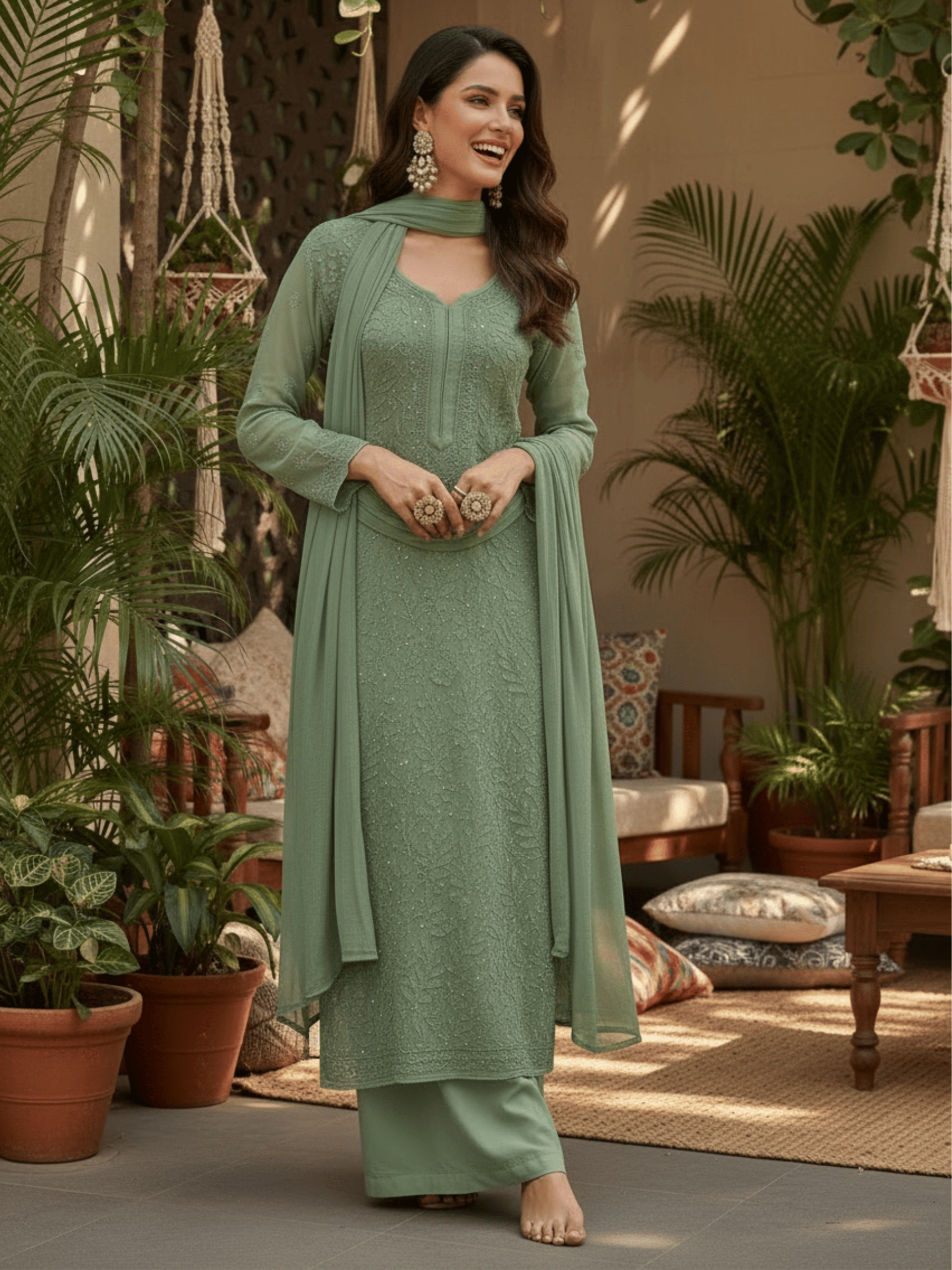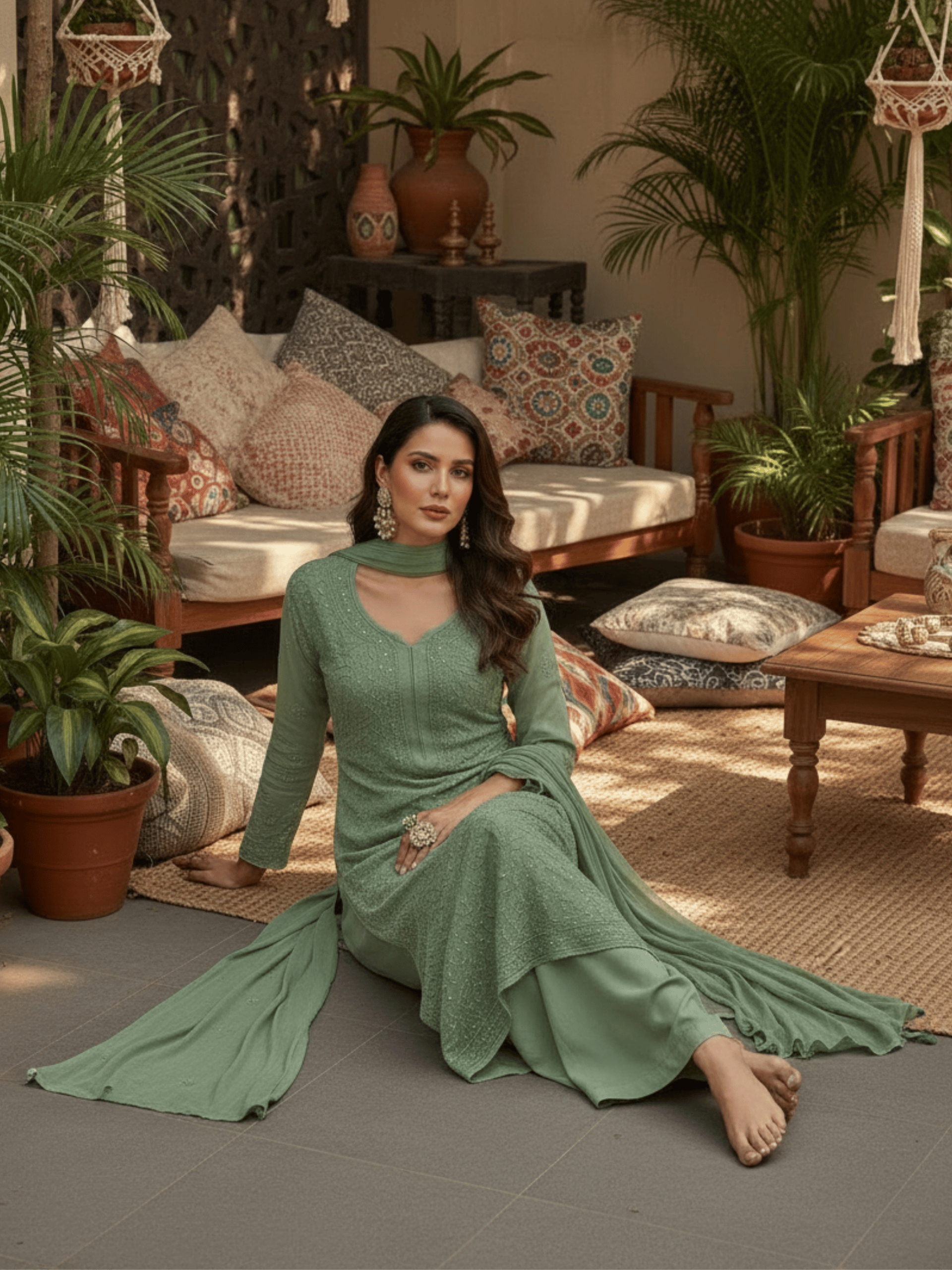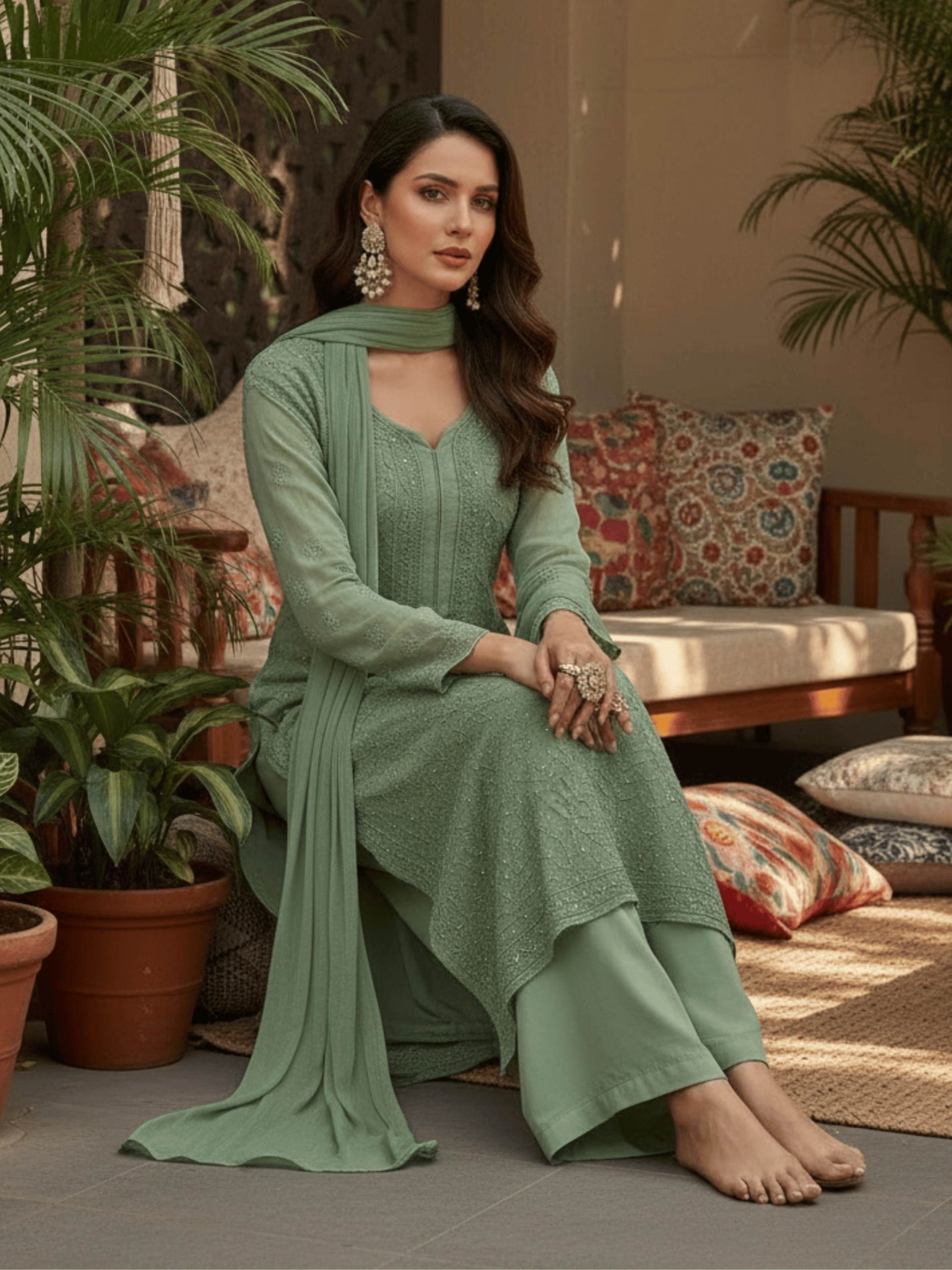 Step into effortless sophistication with the Sage Whisper Full Sleeves Chikankari Kurta Set, a seamless blend of timeless Indian craftsmanship and contemporary style. Designed for women who appreciate elegance with a modern edge, this ensemble brings together the delicate artistry of Lucknowi Chikankari embroidery and subtle Mukaish detailing in a serene and refreshing sage green hue. Perfect for festive gatherings, day celebrations, poojas, or simply elevating your summer wardrobe, this set is a celebration of heritage reimagined for todayās woman.